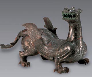 错金银铜双翼神兽,其形象似狮非狮,雄狮样的兽头向一侧高高昂起,怒目圆睁,张口咆哮,长舌挺起,利齿交错排列,前胸宽而低沉,两肋生翼,后臀隆起,利爪外撇,平稳有力地撑住躯体,随时准备腾空而起。兽身用粗细不同的银片、银丝错出千变万化的纹饰,背上还有两只蟠曲于云中的小鸟,使威武凶猛的神兽显得生动而神秘。