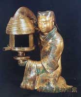 长信宫灯 发布时间:2015年04月10日 制造年代: 西汉(公元前206年~公元8年) 出土日期: 1968年 出土地点: 河北省满城陵山中山靖王刘胜妻窦绾墓 类型: 文物精品 简介:长信宫灯 长信宫灯通体鎏金,作宫女跪坐执灯形象。宫女梳髻覆帼,着深衣,跣足。由头部、身躯、右臂、灯座、灯盘、灯罩等部分组成。各部分可拆卸,灯盘可转动。灯罩可开合。宫女体臂中空,右臂为烟道,可将灯烟导入器内,以保持室内清洁。灯上刻铭文九处,内容包括灯的重量、容量、铸造时间和所有者等。因刻有“长信尚浴”字样,故名长信宫灯。 尺寸: 通高48厘米 现藏地点: 河北省博物馆